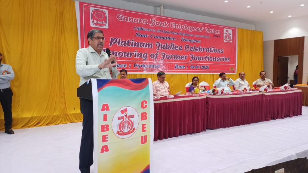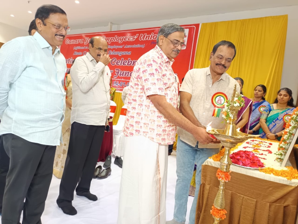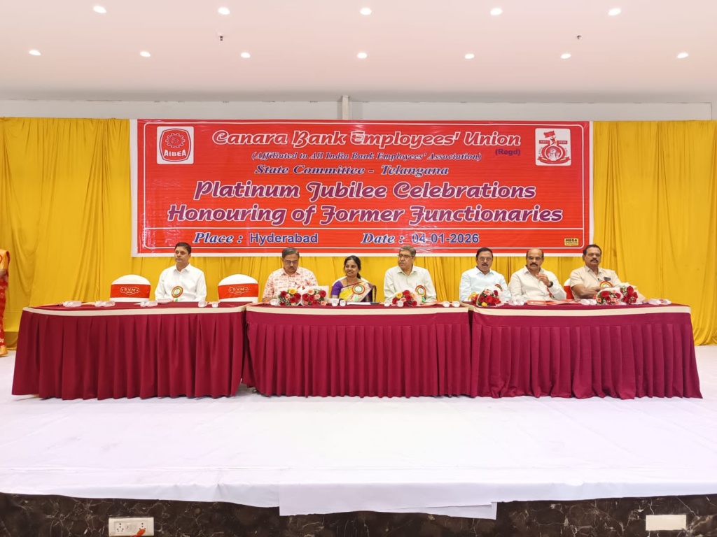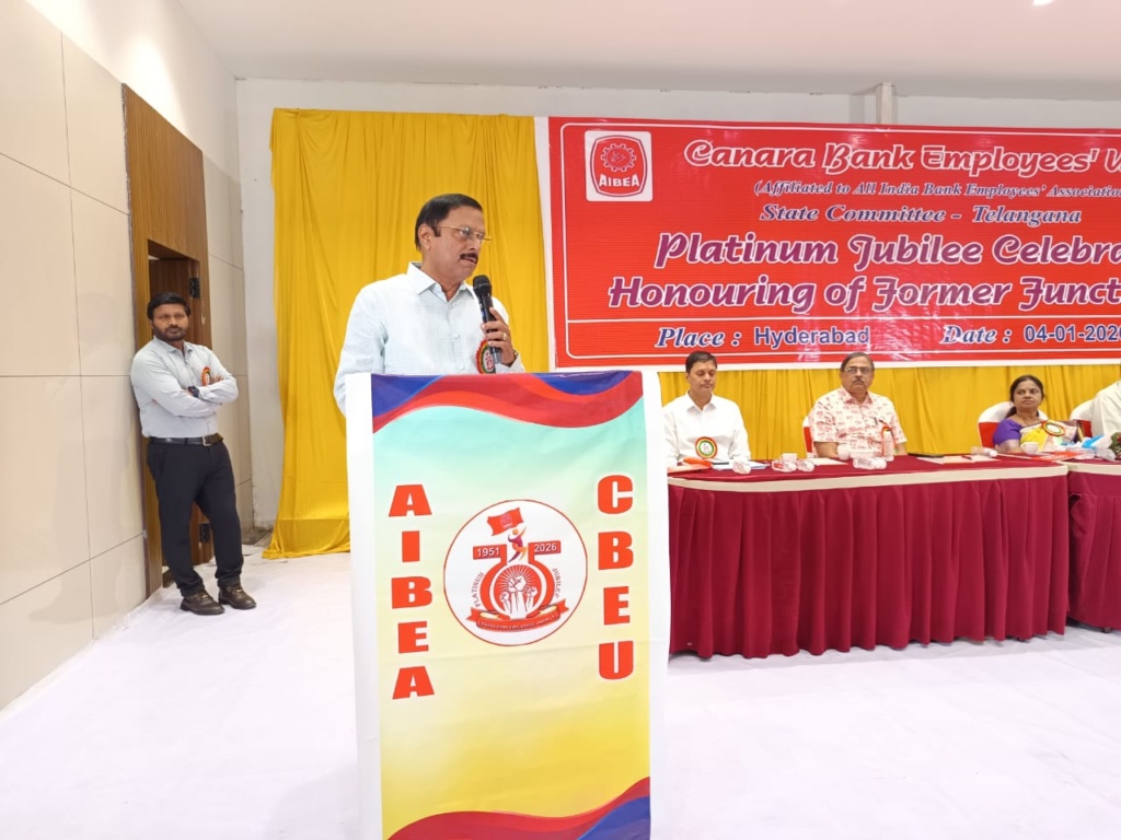Com M S Srinivasan, President, CBEU; Com B S Rambabu, Secretary, AIBEA; Com B Ramprakash, General Secretary, CBEU; Sri Kalyan Mukherjee, CGM, Canara Bank, Hyderabad circle spoke.