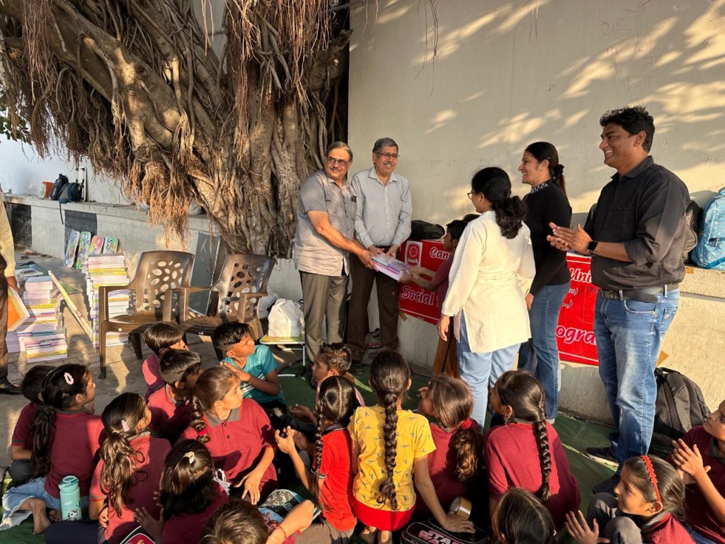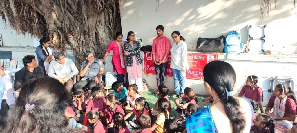 Around 90 students studying in different schools(public and private) in different medium and hailing fron slum areas are being nurtured and given free tuition/activities like yoga, spoken English, skill development etc. in the evening under a banyan tree by six home maker ladies. It is known as Sandhya Shala(evening school). The six home makers deserve all appreciation for their dedication without anything in return.
